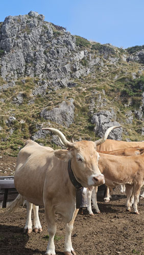 Wenig später geht’s immer höher ins Gebirge, die Straßen werden schmaler und steiler, die Serpentinen enger. Und immer schön aufpassen: Denn hier musst du jederzeit damit rechnen, von freilaufenden Kühen am Straßenrand überrascht zu werden. Plötzlich durchbrechen wir die Wolkendecke – und auf einmal liegt die wunderschöne Pyrenäenlandschaft in strahlendem Sonnenschein vor uns!