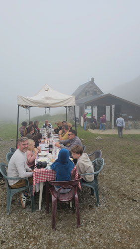 Zurück an der Hütte wird eine lange Tafel gedeckt, denn Cédrics Mutter hat für alle Gäste gekocht. Ein echtes baskisches Festmahl: Es gibt eine kräftige Gemüsesuppe mit würzigem Speck, danach das traditionelle Axoa de Brebis, ein baskisches Schafsragout mit Piment d’Espelette und typischen Zutaten der Pyrenäen. Dazu trinken wir Weiß- und Rotwein aus der Region. Zum Abschluss kommen frischer Schafskäse (Fisselle) mit Honig und hauchdünne Scheiben Ossau-Iraty auf den Tisch.