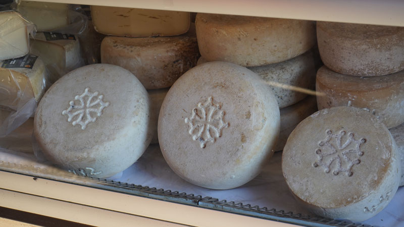 Übrigens: Auf den Schafskäsen der Ferme Récébire findet ihr auf der einen Seite das okzitanische Kreuz als Symbol der Ferme Récébire, das Cédric übrigens auch stolz als Tattoo auf seinem Arm trägt. Auf der anderen Seite sehr ihr einen Schafskopf mit einem „F“ in der Mitte, das für fermier (Hofproduktion) steht. Die Almkäse, die hier auf der Cabane d’Arlas im Sommer hergestellt werden, tragen zusätzlich die Estive-Marke – ein Edwelweiß inmitten eines Bergmotivs!